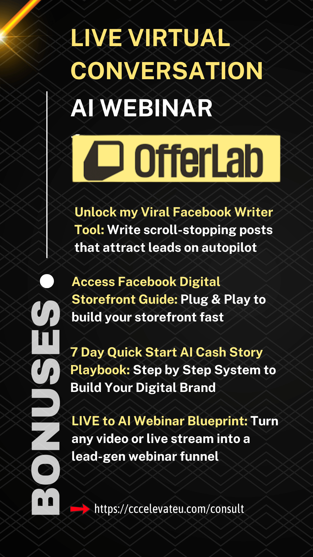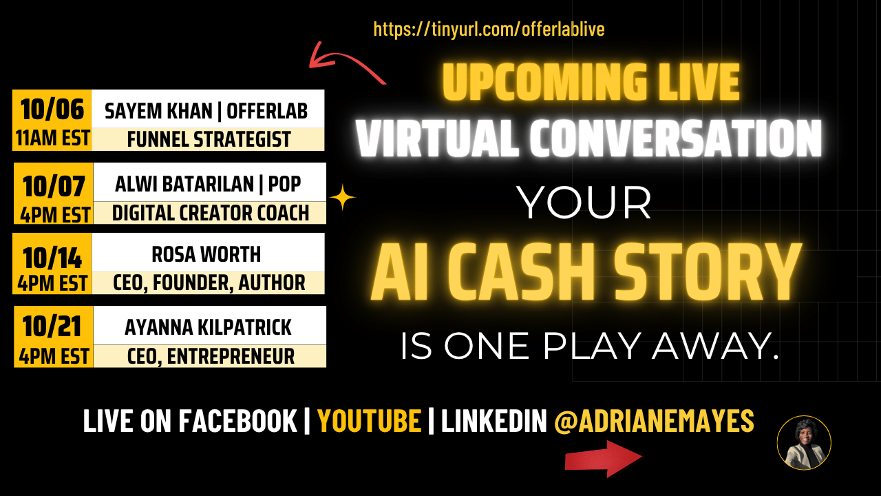 Offer Lab isn’t just about going LIVE. It’s a proven platform where your authentic story becomes a strategic asset. When you join a LIVE Virtual Conversation with Adriane Mayes, you’re not just showing up - you’re standing out. We help you: